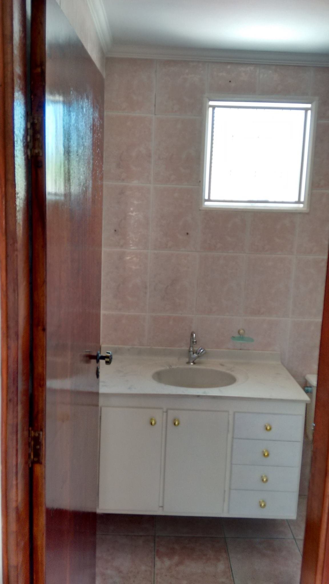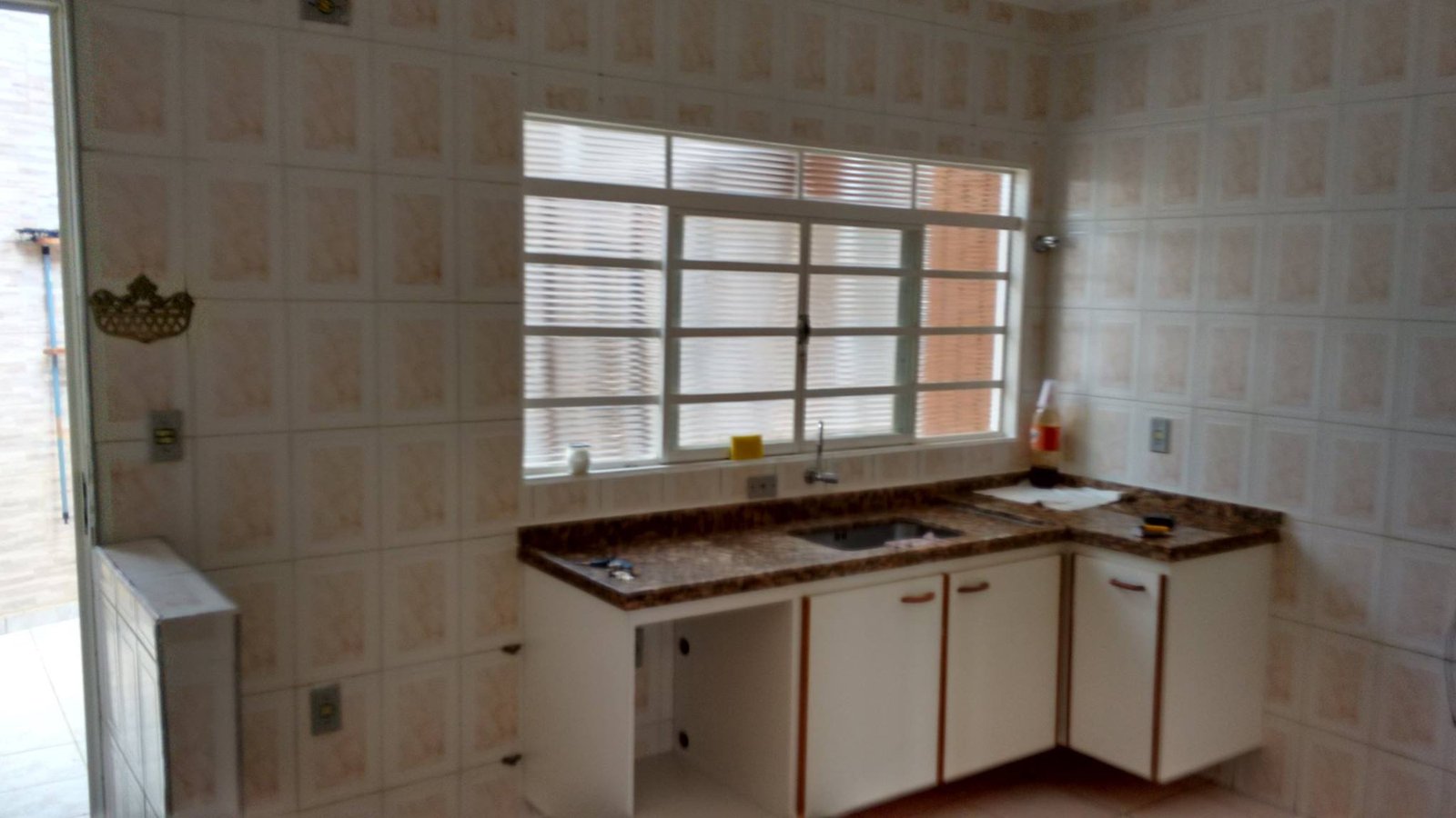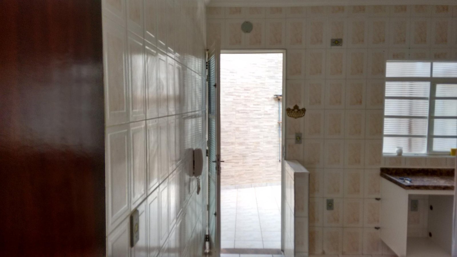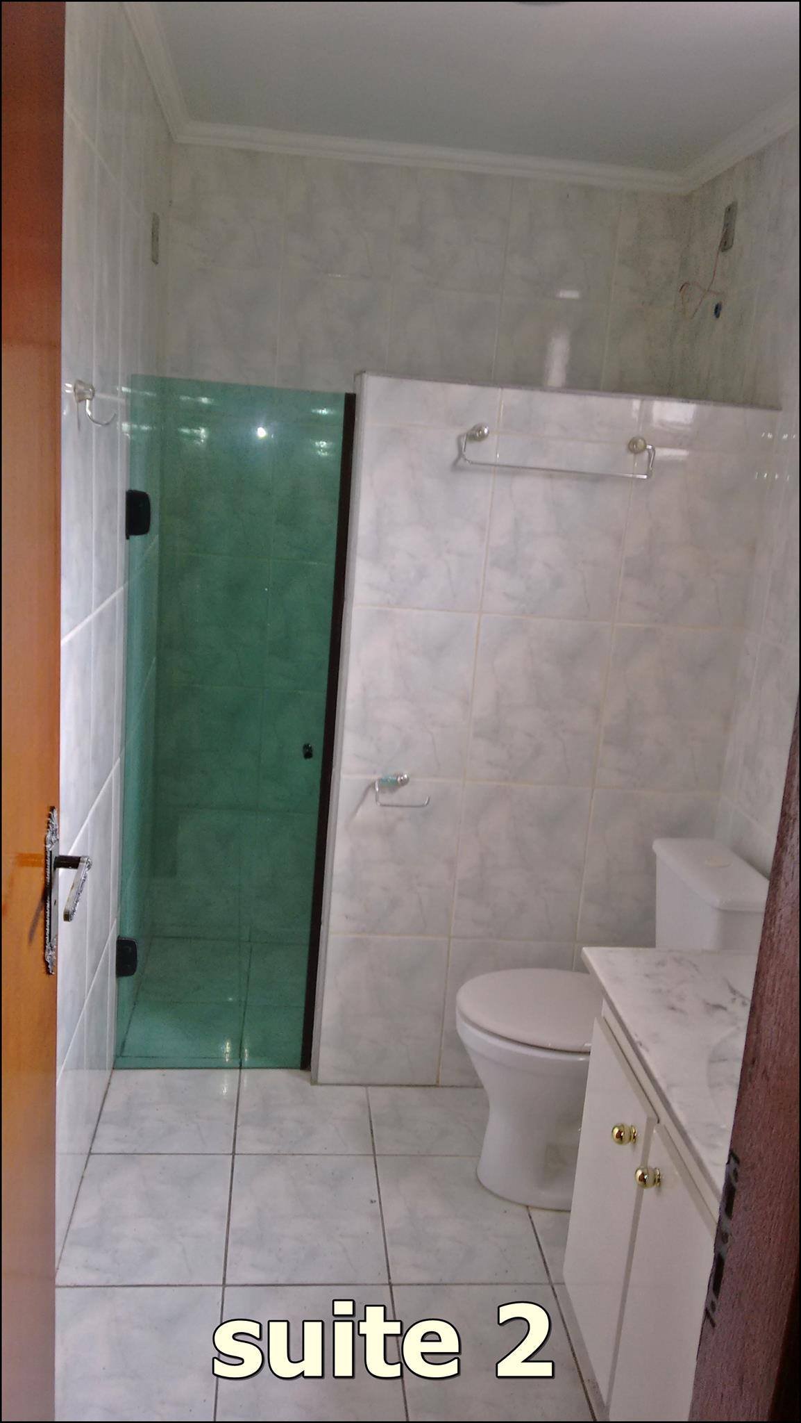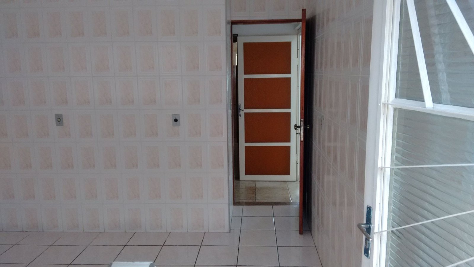 Cozinha azulejo em meia parede, banheiro com azuleijo até o teto.