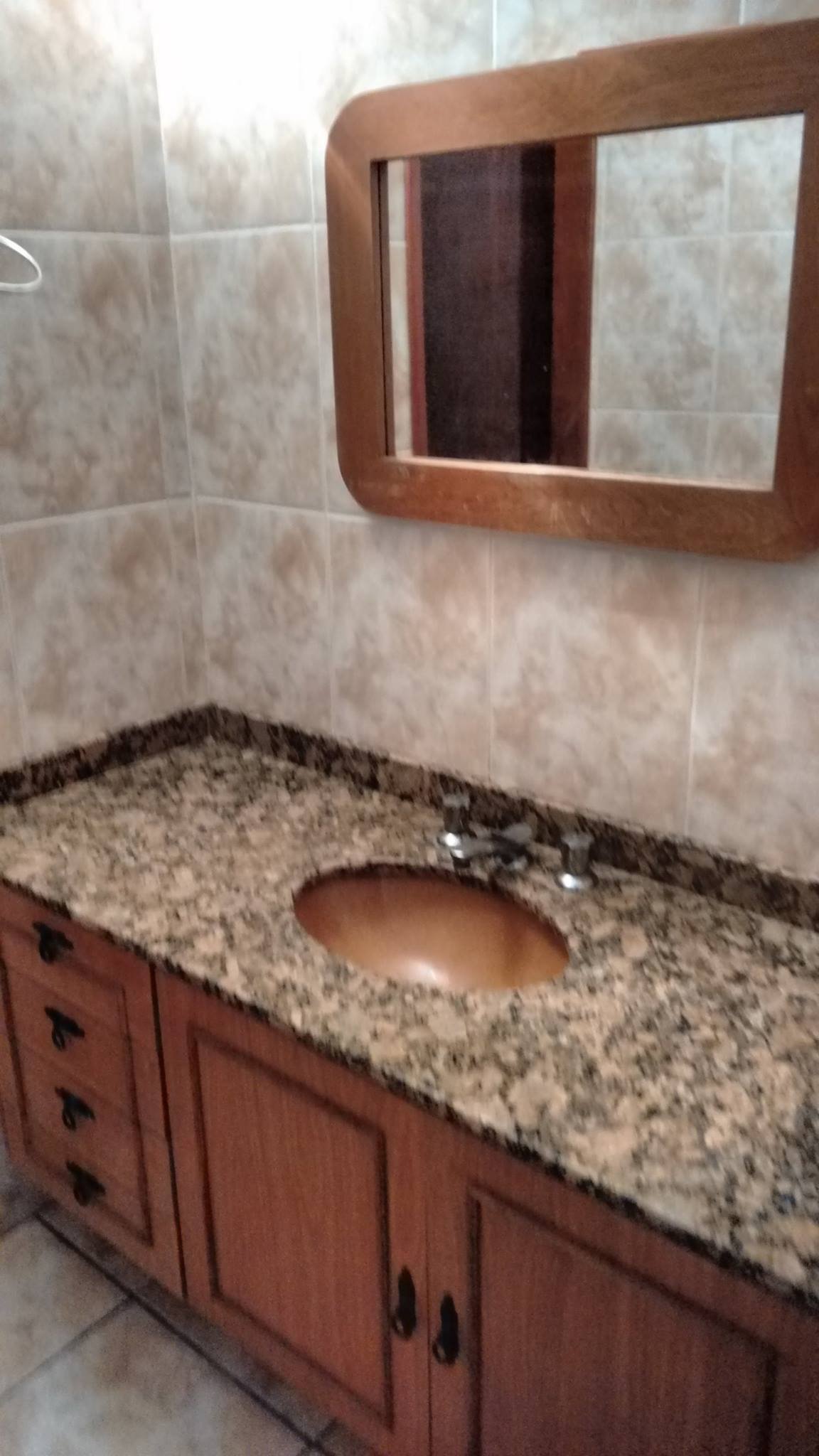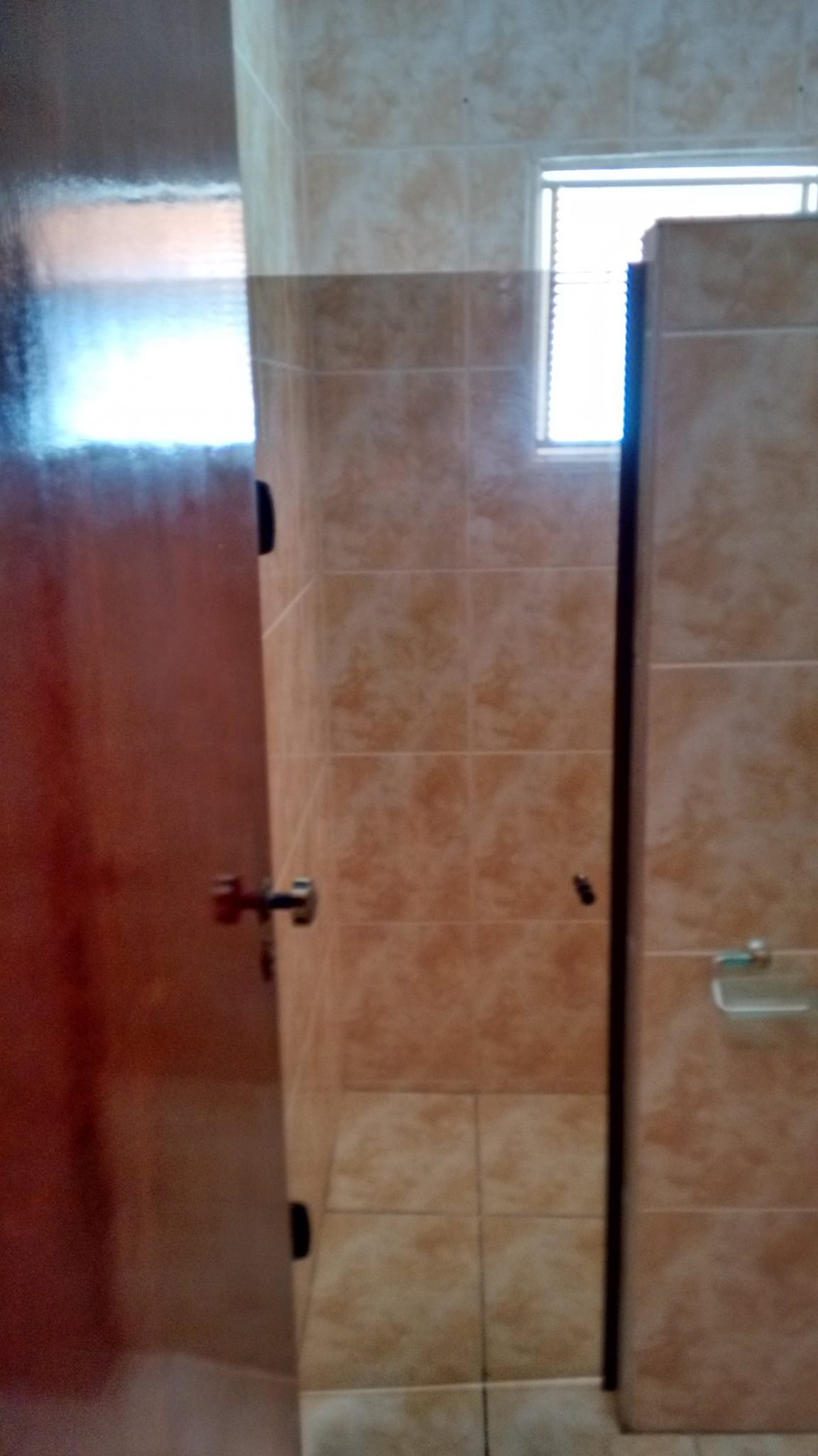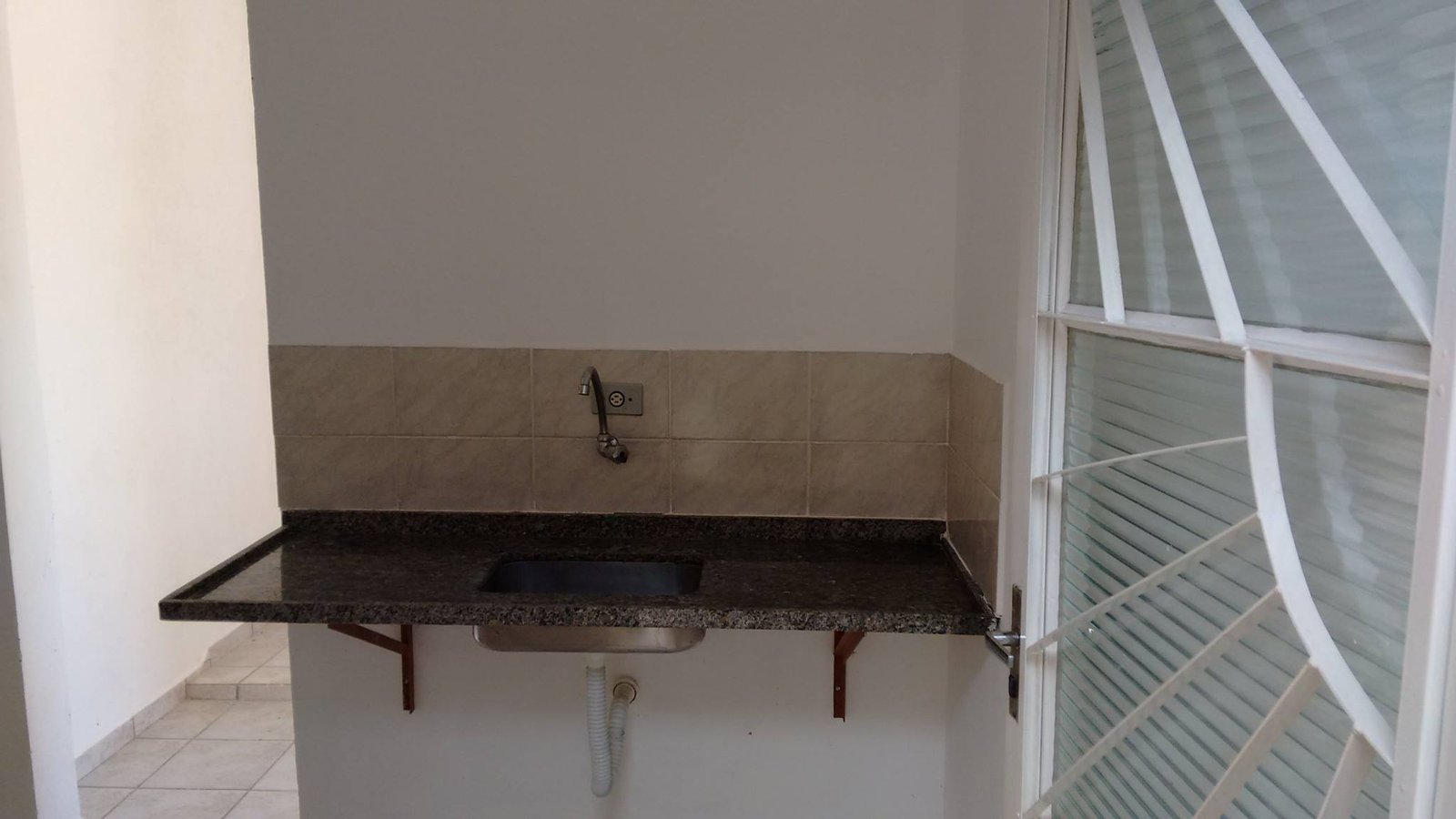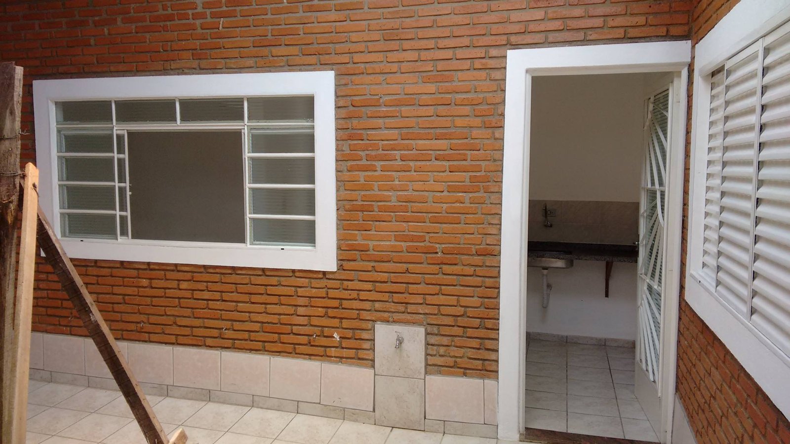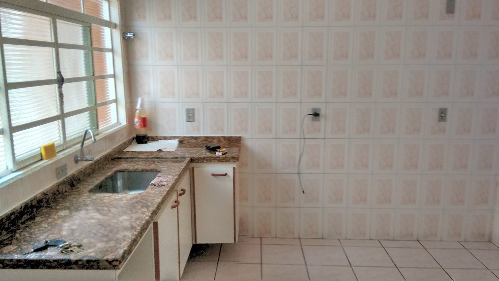 Cozinha azulejo em meia parede, banheiro com azuleijo até o teto.